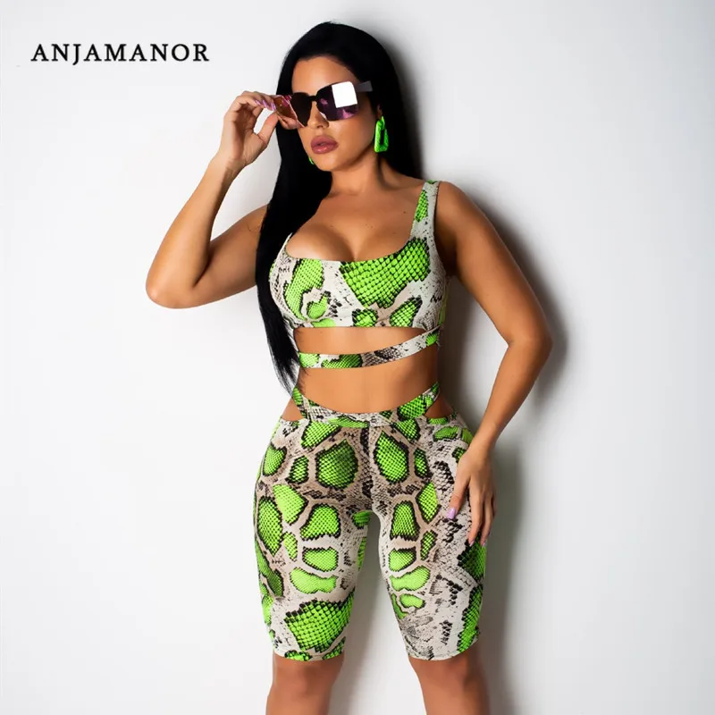 معرض ل ANJAMANOR النيون الأخضر الأفعى الجلد طباعة ضمادة Bodycon 2 قطعة مجموعة مثير وتتسابق للمرأة مطابقة مجموعات السراويل الصيف D29-AA56