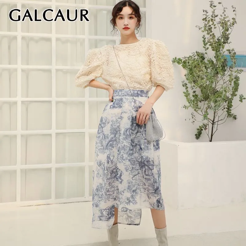 صور ل GALCAUR أنيقة النساء اثنين من قطعة مجموعة V الرقبة نفخة كم الضمادات قمم طباعة عالية الخصر غير المتكافئة ميدي تنورة الإناث دعوى الربيع